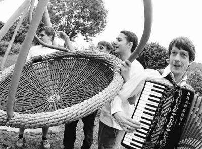 Während seine ehemaligen Kollegen an einer Schaukel arbeiten, unterhält Wolfram Karrer sie mit Musik.