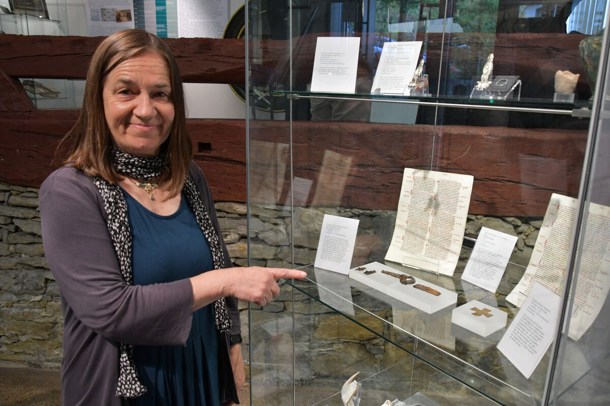 Die Archäologin Dorothee Ade zeigt Grabfunde, die in der Mössinger Kulturscheune ausgestellt sind. Sie sind Teil der Ausstellung zum Glaubensleben im Steinlachtal. FOTOS: MEYER
