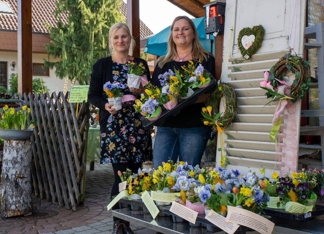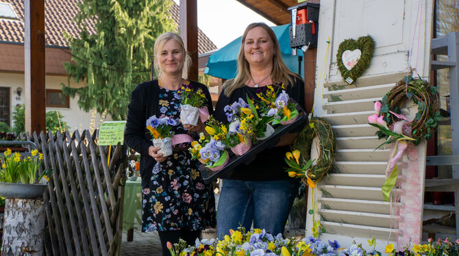Die beiden Floristmeisterinnen Kerstin Nagel-Luik (links) und Marion Rättig-Nagel in Kirchentellinsfurt setzen mit Blumenpräsenten in Corona-Zeiten ein Zeichen. FOTO: BÖHM