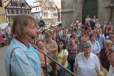Barbara Scholkmann empfing ihre Zuhörer an der Stiftskirche. Von dort aus ging's tief in die Tübinger Geschichte.