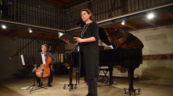 Die Stuttgarter Sprecherin Tine Kiefl (rechts) zitiert Heine, Uhland und Einstein und unterstreicht damit die Melodien von Urs Läpple (links) und Susanne Götz am Klavier. FOTO: JAENSCH
