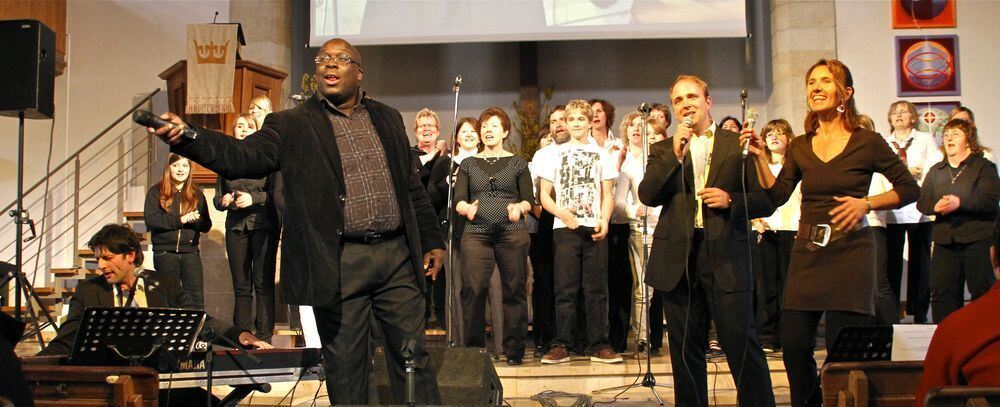 Bezog auch das Publikum mit ein: Lead-Sänger Junior Robinson, unterstützt von Andy Doncic (links), Leiter der Gospel-Company Bietigheim-Bissingen, und dessen Schwester Evi Sturm 8rechts), daneben Andreas Könneck und im Hintergrund der Gospel-Projekt-Chor Gomaringen.