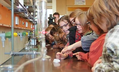 Minus 78 Grad kalt: Der kleine Eisbrocken auf dem Labortisch ist die große Attraktion für die Viertklässler der Gomaringer Schloss-Schule.