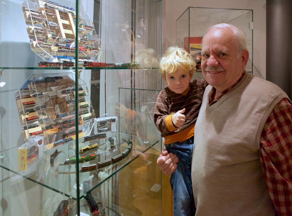 Daumen hoch! Der zweieinhalbjährige Emil auf dem Arm seines Gomaringer Opas Werner Jenter ist fasziniert. Jenter ist einer der Leihgeber der Ausstellung, hier vor seinen Modellen »Märklin Spur Z«. FOTO: HAMMER