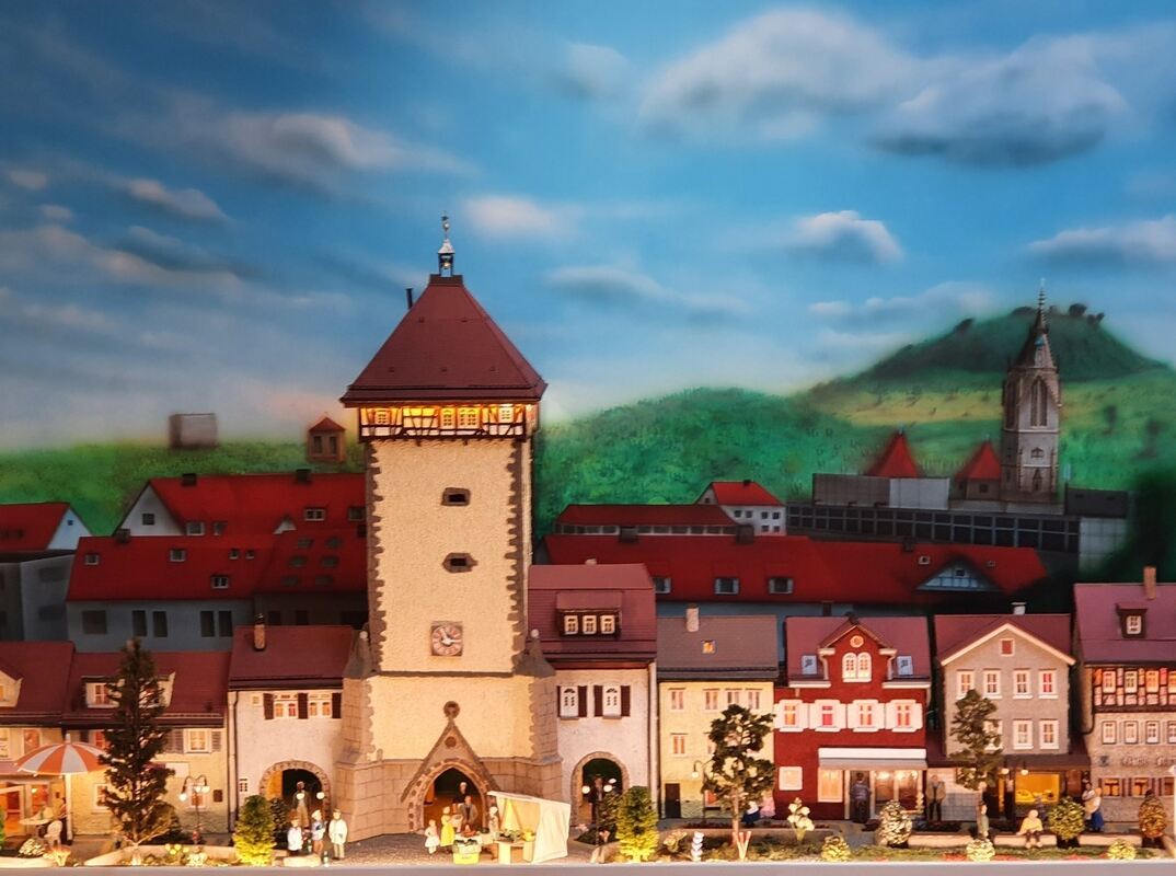 Das Werk hat den Reutlinger Adalbert Licek 1 500 Stunden gekostet und wurde 1999 fertiggestellt. Sechs Wochen lang stand es um die Jahrtausendwende im Eingangsbereich des Reutlinger Rathauses, ehe es eine Odyssee auf sich nahm. Die Nachbildung wurde vom Stadtmarketing auf der Tourismus-Messe in Stuttgart ausgestellt. Dann hatte es ausgedient, verstaubte in einem Lager und landete beinahe auf dem Müll, trotz des sehenswerten Zustands. Schütz und Klink sorgen also für ein Fortbestehen des Dioramas. Das Gemälde im Hintergrund, auf dem die Achalm und die Marienkirche abgebildet sind, stammt aus dem Pinsel von Andreas Schadhauser.