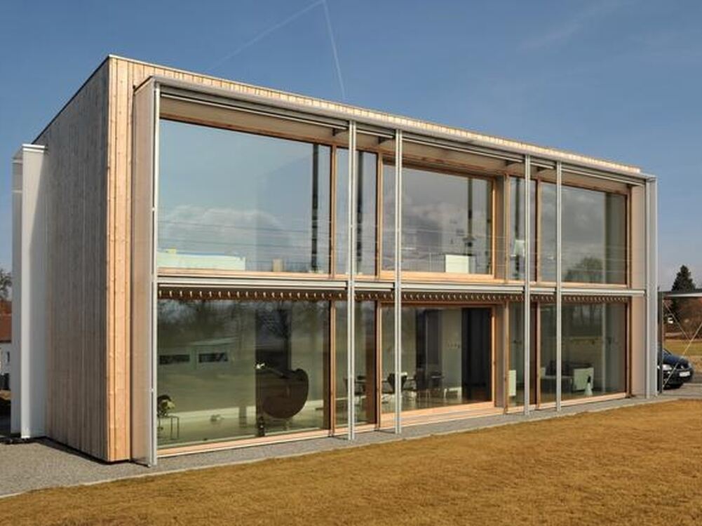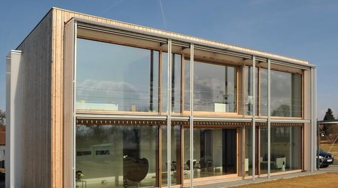 Wohnen fast wie im Freien: Bei zu viel Sonne lassen sich an der komplett verglasten Südseite über das vorgelagerte Stahlgerüst Rollmarkisen ausfahren.
