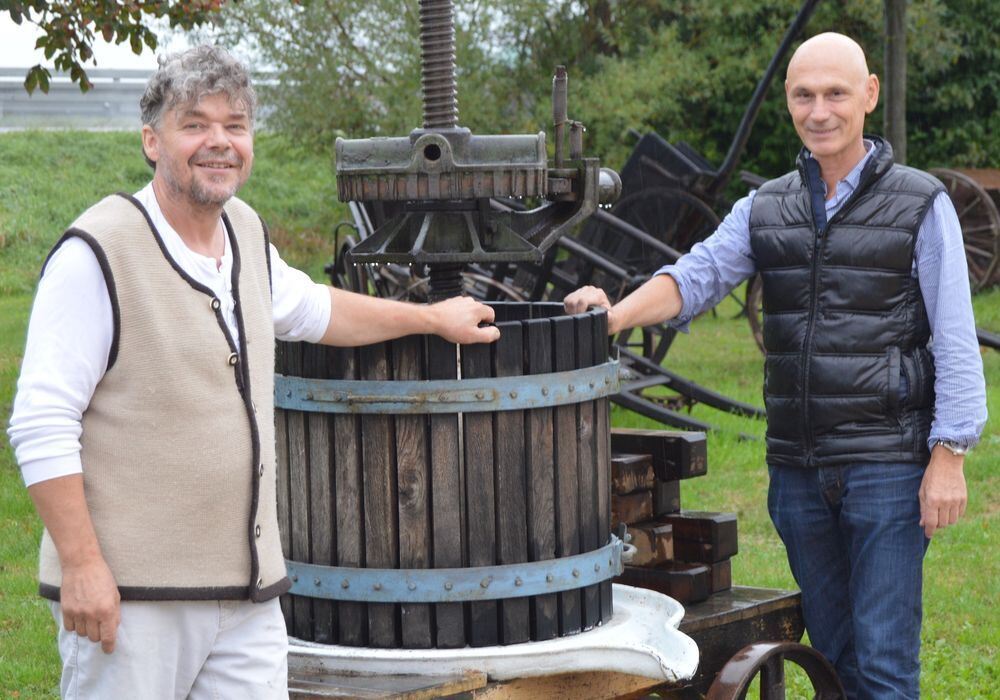 Die Hauptorganisatoren Matthias Bader (links) und Armin Knoblich zeigen, wie in früheren Zeiten gemostet wurde. FOTO: VEY