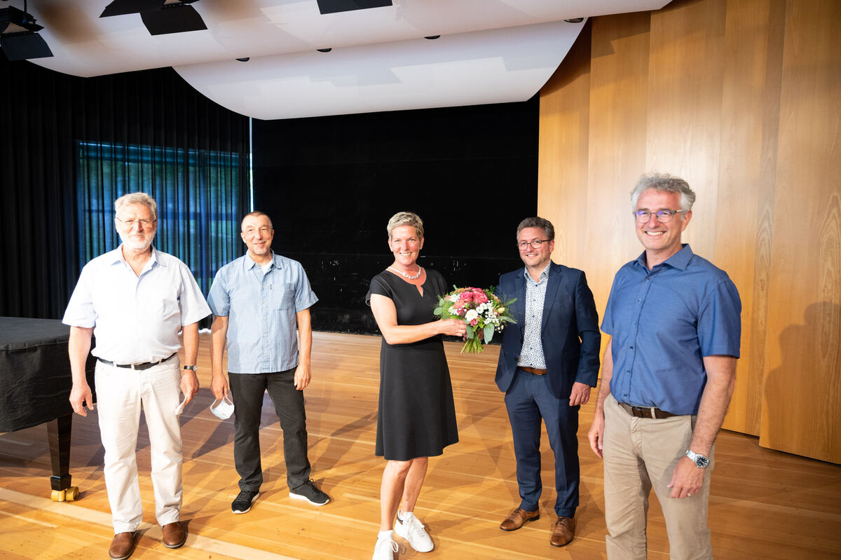 Michael Bulander gratuliert Mirjam Bott zur Wahl als zweite Vorsitzende. Rechts daneben Ralf Kuch, links Gebhard Koll und neben ihm Schulleiter Wolfgang Schnitzer. FOTO: EBER