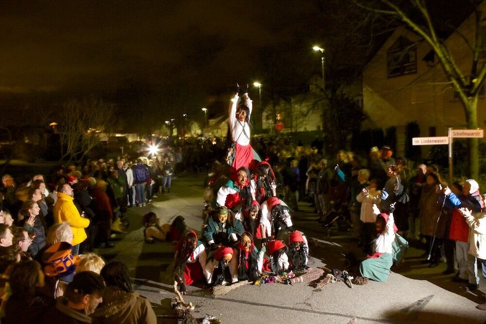 Vom Publikum gefeiert: die gastgebenden Gomaringer Schlosshexen beim Pyramidenbau.