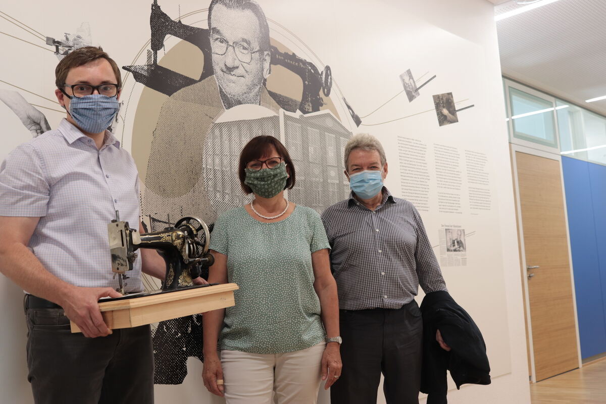 »Eine große Geste« sei die Schenkung, sagt Bürgermeister Steffen Heß (links). An Gerhard Ankele erinnert jetzt nicht nur das Wandbild im Erdgeschoss, sondern auch seine Nähmaschinen. Roseline Geisel und Alfred Ankele besichtigten gestern beides. FOTO: WALDERICH