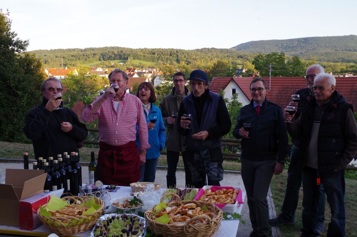 Der Gomaringer Schlosswein mundete den Teilnehmern der Weinprobe, darunter Jürgen Hirning(Zweiter von links), Bürgermeister Steffen Heß (Sechster von links) und Manfred Klimisch (rechts). Foto: Hirning