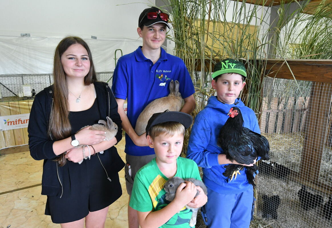 Geschwisterliche Jugendzüchter bei der Jungtierschau: Vorne Max Rath mit seiner Farbenzwerg-Häsin, daneben rechts Bruder Ben mit seinem Kleinwidder. Hinten Sabrina und Carsten Schaible mit ihren Separatorkaninchen. FOTO: MEYER