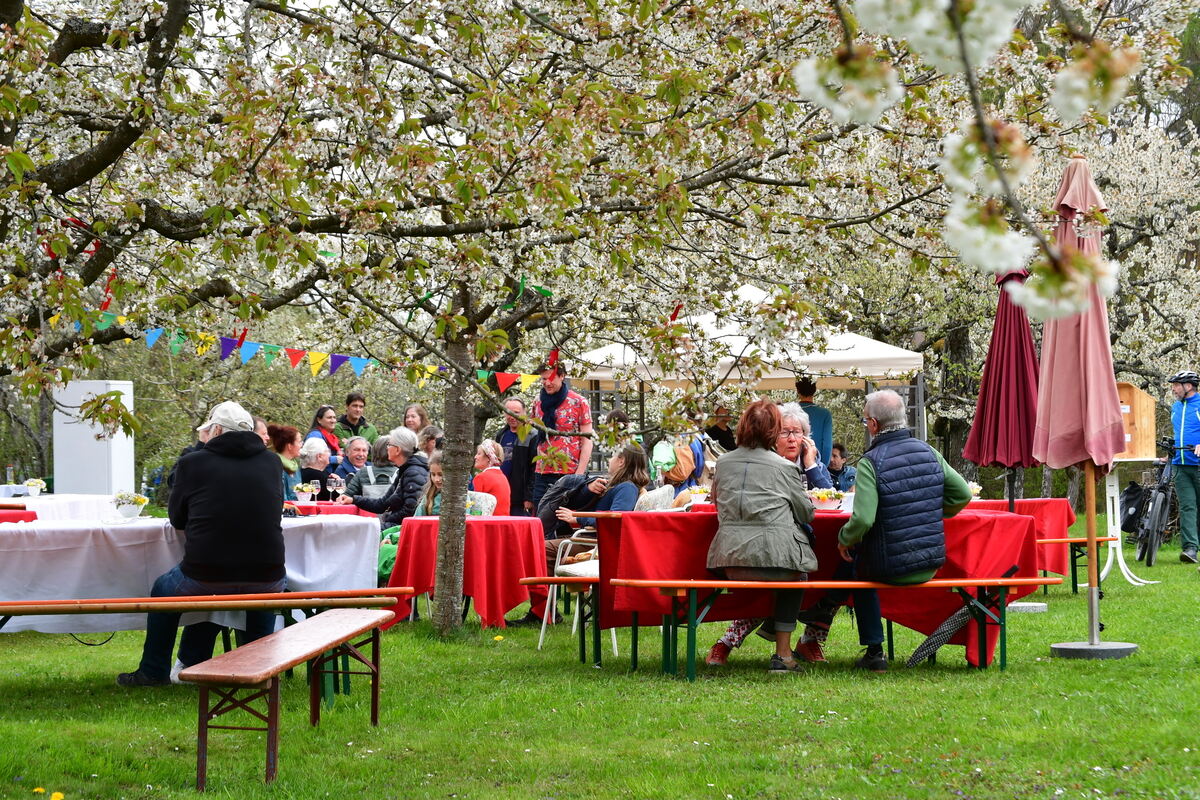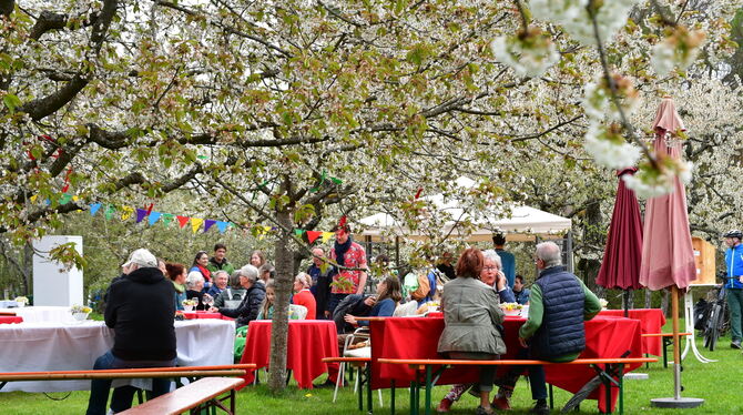 Trotz des bewölkten Wetters war das Kirschblütenfest in Nehren gut besucht. Weiße Blüten schweben in den kommenden Tagen und Wochen über den grünen Wiesen.