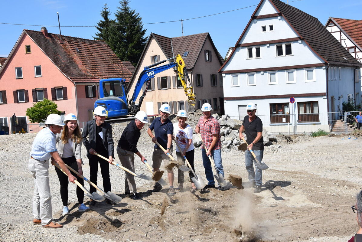 Beim Spatenstich in Aktion: Architekt, Bürgermeister, Gemeinderäte und Mitarbeiter. FOTO: KREIBICH