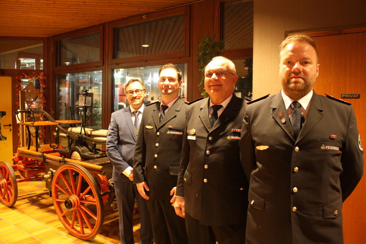 Wachablösung bei der Freiwilligen Feuerwehr Gomaringen (von links): Bürgermeister Steffen Heß, der neue erste Kommandant Stefan Röhm, dessen VorgängerJochen Ankele und der neue erste Stellvertreter, Daniel Junger.