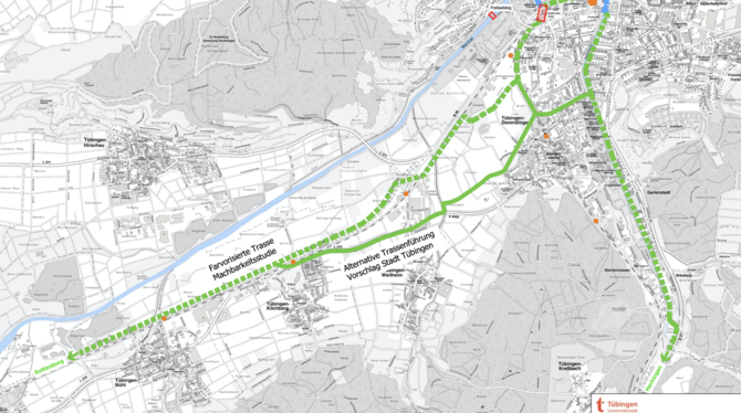 Die neue Variante der Stadt verknüpft die Linienführung an der B28 von Rottenburg bis Kilchberg über eine bereits fertige Unterführung mit einer Strecke südlich der Bahn durch den Saiben zum Behördenviertel bis zur Radbrücke West. »Das verspricht maximale Erschließung und beste Nutzung bei geringen Kosten«, sagt Boris Palmer. »In Tübingen findet die von uns vorgeschlagene Trasse Anschluss an die Regionalstadtbahn am Haltepunkt Mühlbachäcker. Auch das Behördenviertel mit seinen zahlreichen Arbeitsplätzen wäre hervorragend angebunden. Außerdem ist die neue Trasse bestens mit dem Radvorrangroutennetz in Tübingen verknüpft, das wir gerade bauen.«