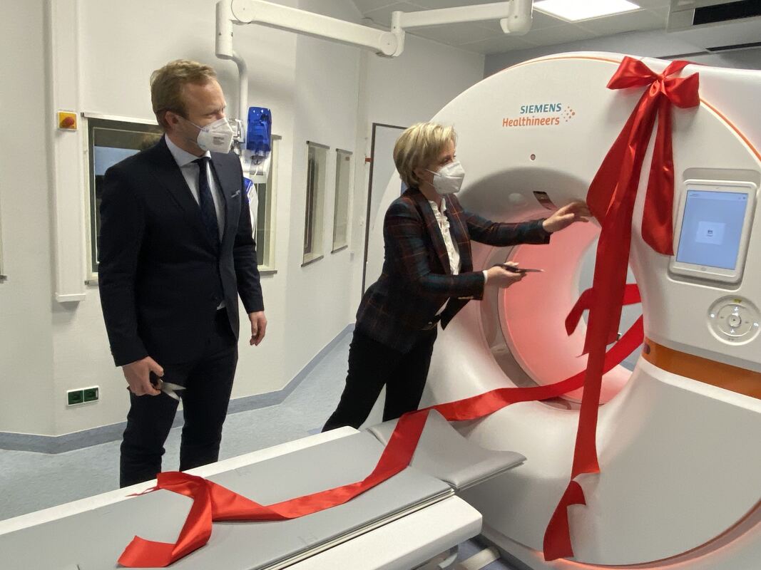 Fabian Bamberg von der Uniklinik Freiburg und Wirtschaftsministerin Nicole Hoffmeister-Kraut nehmen das neue CT-Gerät der Uniklinik Tübingen in Empfang.