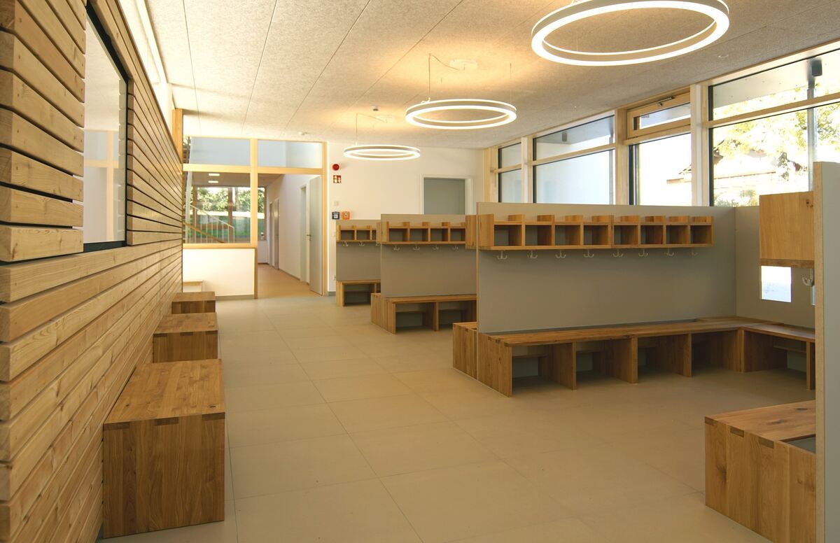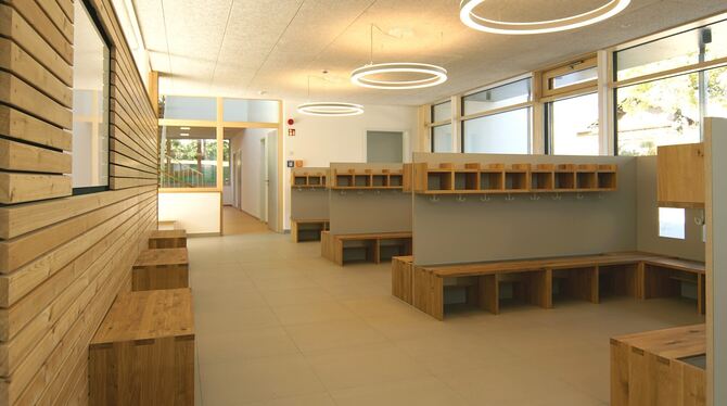 Die Wand links trennt die Garderobe von der Mensa im neuen Kinderhaus Florian. FOTO: ORTH