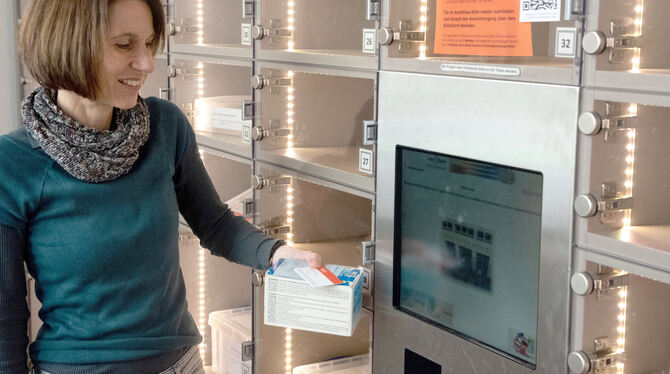 Büchereimitarbeiterin Monika Fridrich am Medienschrank der »Bibliothek der nachhaltigen Dinge« in der Tübinger Stadtbibliothek.