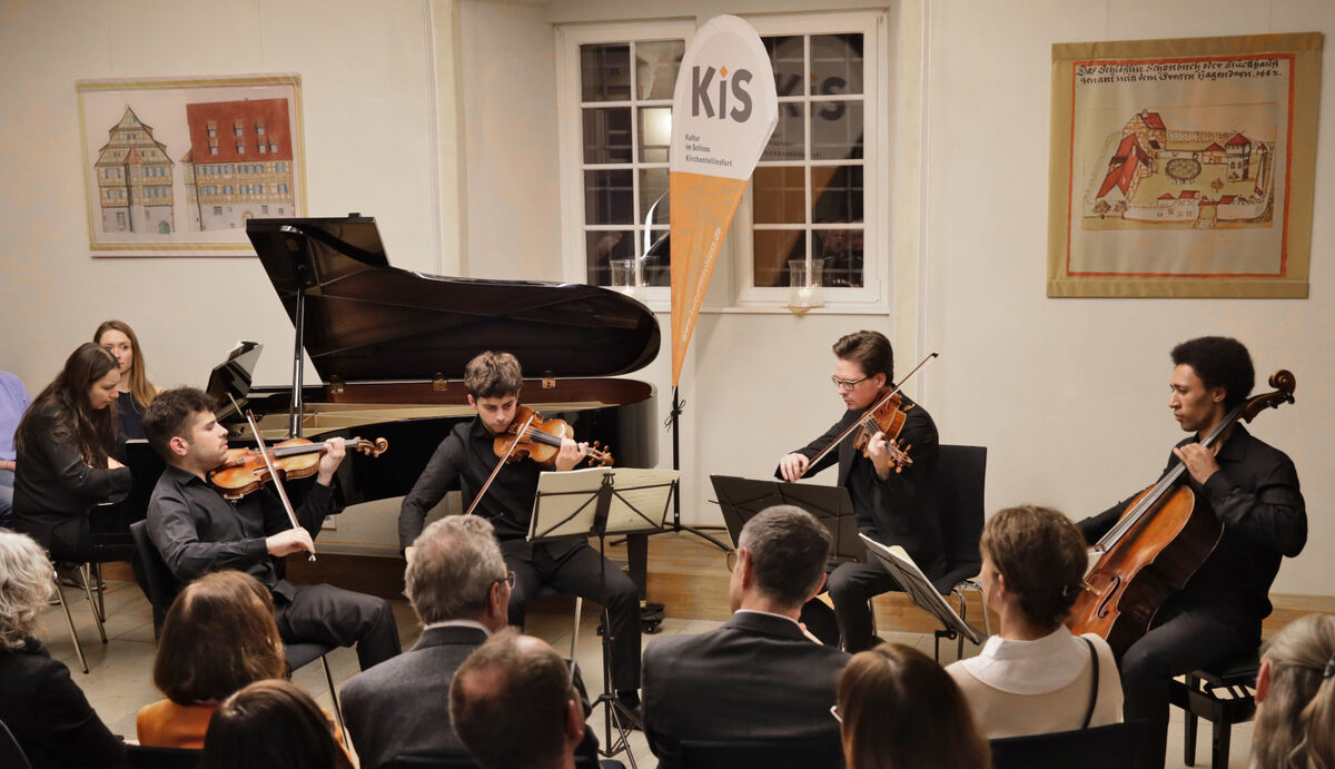 Das Ensemble, alle Musiker unter 30 Jahre alt, präsentierte in wechselnden Besetzungen mit der Pianistin Cristina Marton-Argerich ein Programm künstlerischer Vielfalt und Tiefe mit Werken der Romantik. Das Neujahrskonzert wurde von Ruth Setzler, Sprecherin von Kultur im Schloss, und von Bürgermeister Bernd Haug mit guten Wünschen für 2026 eröffnet. Unter dem Titel »Klangwelten der Romantik« führte der Cellist Ramon Boss, zugleich Leiter des Ensembles, das Publikum durch den Abend. Schumanns Fantasiestücke für Violoncello und Klavier von Robert Schumann deutete er als musikalische Bergwanderung, die sich aus verträumtem Nebel zu einem mitreißenden Abenteuer entwickelt. Unangekündigt folgte ein »Überraschungsbonus«: Mit der zweiten Pianistin Antonia Miller flogen bei Miniaturen wie »Divertissement a l' Hongroise« von Franz Schubert, dem »Elfenmarsch« von Mendelssohn und zwei ungarischen Tänze vom Brahms zwanzig Finger über die Tasten.