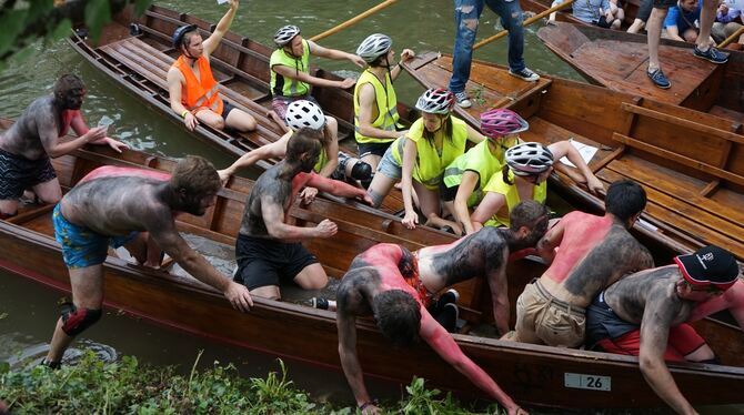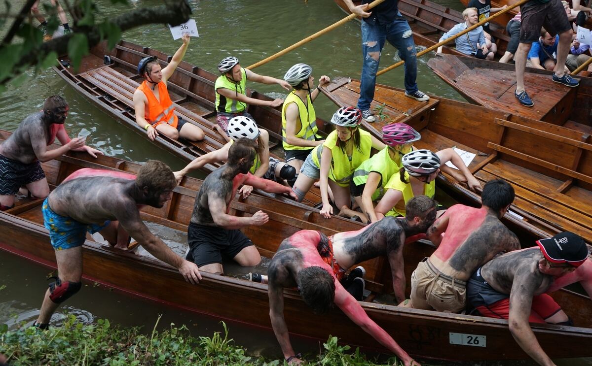 »Entscheidend ist vor allem der gute Stocherer«, sagte Simon Schübel, der das Rennen mit organisiert hatte. »Die haben definitiv geübt.« Als die Masse der Kähne die Engstelle erreichte, wurde es schnell viel zu eng. Um jeden Zentimeter kämpften die bisweilen bunt verkleideten Besatzungen. Der eine oder anderer fiel dabei auch ins Wasser.