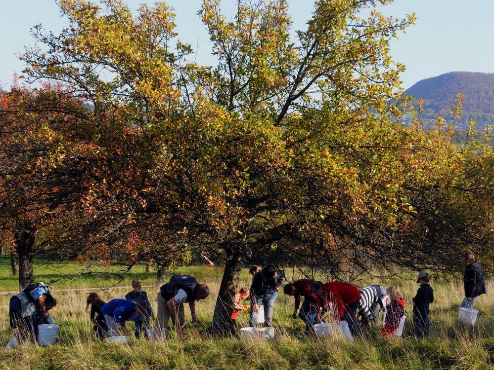 »Nur die Faulen bleiben liegen«: Apfelsammelaktion des Netzwerkes Streuobst am Fuße des Farrenbergs in Bästenhardt. GEA-FOTO: MEYER