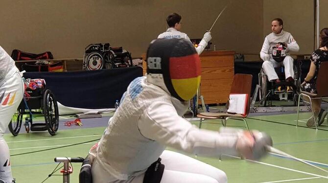 Nils Neumann in voller Montur: Die Sportler werden mit dem Rollstuhl eingespannt. Bewegt wird im Kampf nur der Oberkörper. FOTO: PRIVAT