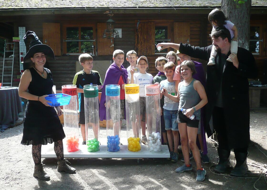Ferienprogramm im Spatzennest in Mössingen: Carolin Dürr (links) mit Hexenhut, ganz rechts Hagrid alias Pascal Eulenberg mit Emelie auf den Schultern. FOTO: JOCHEN