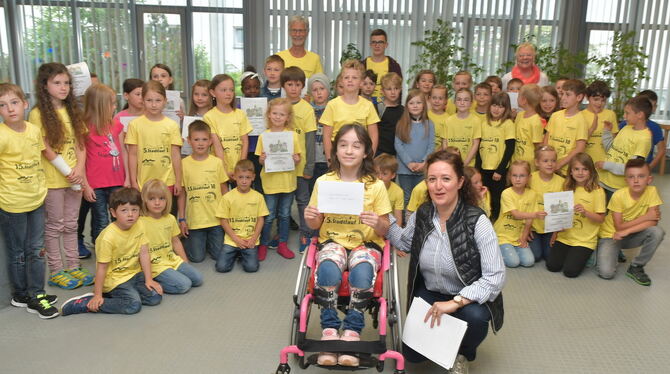 Joelle Vöhringer (im Rollstuhl) nimmt für die Dreifürstensteinschule die Auszeichnung als teilnahmestärkste Klasse beim Mössinger Stadtlauf entgegen. Kadriye Sentürk überreicht die Urkunde. FOTO: MEYER