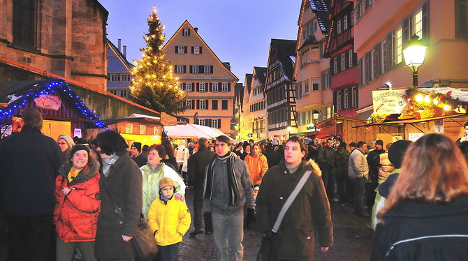 Der Tübinger Weihnachtsmarkt findet von 10 bis 21 Uhr und am Sonntag von 11 bis 19 Uhr statt. Über 300 Marktstände schlängeln sich an allen drei Tagen von der Neckargasse über den Holzmarkt, die Marktgasse, den Marktplatz, Kornhausstraße, Krumme Brücke, Neue Straße, Metzgergasse, Markt am Nonnenhaus, Nonnengasse und Hafengasse. Am Samstag und Sonntag kommen noch die Schmiedtorstraße und der Kelternplatz hinzu.