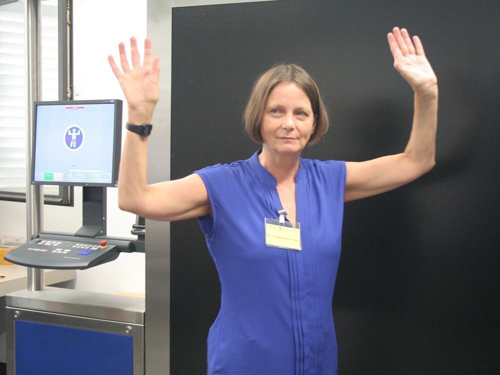 Hände hoch und um die Achse drehen. Die Ethikerin Regina Ammicht Quinn zeigt die richtige Haltung im Körperscanner.