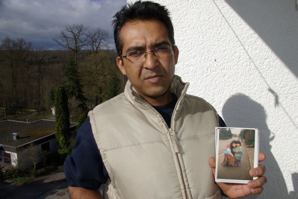 Agron Mujaj mit einem Bild aus seiner ersten Zeit in Kirchentellinsfurt. Es zeigt seine jüngste Schwester Arbolena (rechts), die schon in Deutschland geboren wurde, und seine heutige Frau Dude in der Gächtstraße.