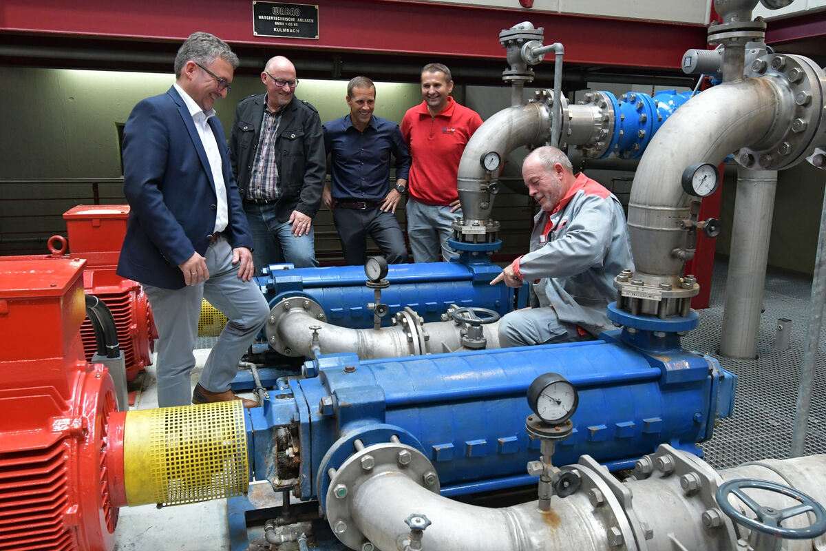 Den Hahn zudrehen tun sie natürlich nicht (von links): Mössingens OB Michael Bulander, Sachgebietsleiter Bernd-Peter Häcker, Kassenverwalter Michel Henne und die Wassermeister Tomislav Galesic und Roland Eissler.