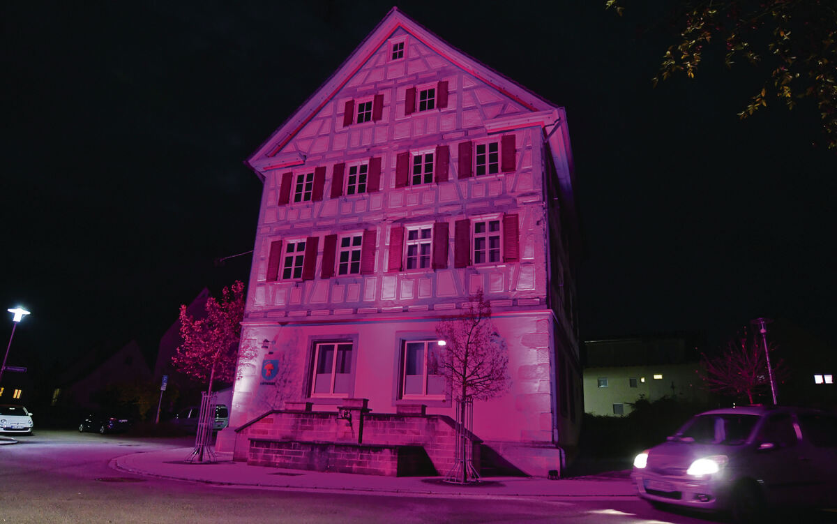 Ofterdinger Rathausfassade am Weltfrühgeborenentag lila beleuchtet