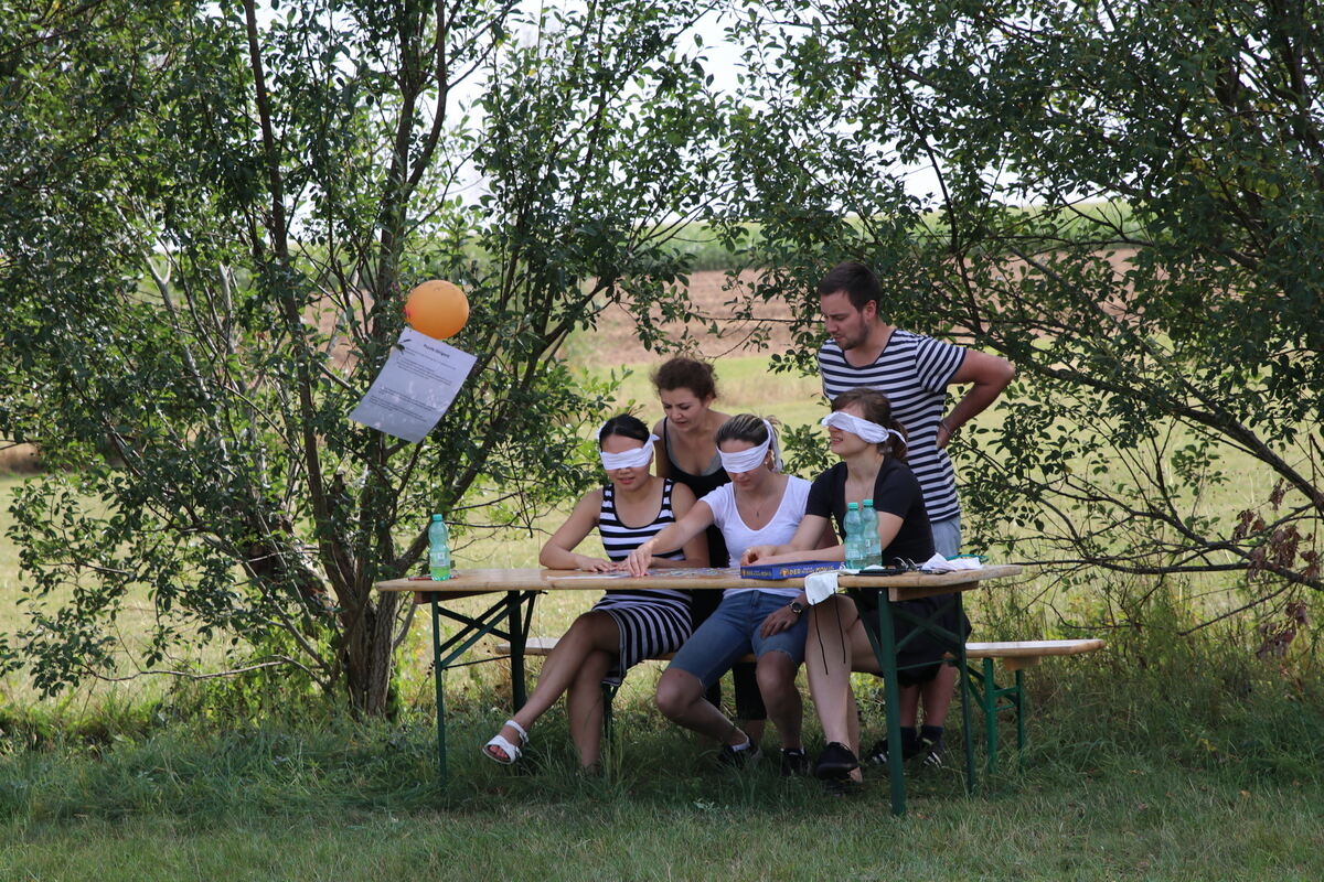 Teambuilding im Bootcamp: Maria Spohr und Philipp Schröder leiten ihre »blinden« Kollegen beim Puzzeln an. FOTO: JULIANE POHL