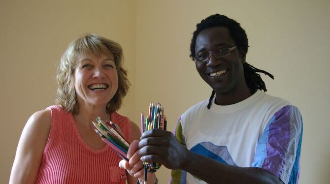 Koffer voller Spenden und die Hände voller Buntstifte: Renate Gauger und Boukary Barry kurz vor dem Abflug nach Westafrika.