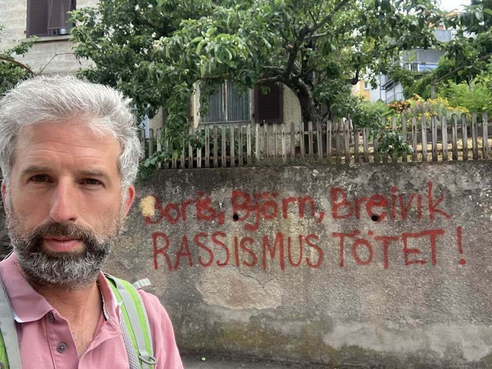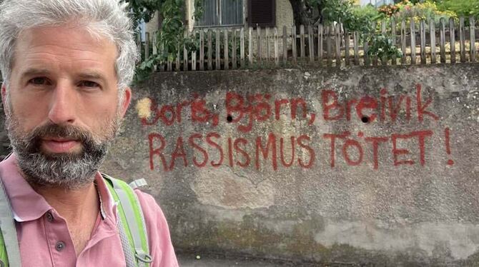 TÜBINGEN. Anders Breivik ist ein norwegischer Massenmörder, der 77 Teilnehmer eines Zeltlagers erschossen hat. Der deutsche AfD-Politiker Björn Höcke gilt als rechtsextrem und wurde im Juni wegen Verwendung von Nazi-Sprache angeklagt. Und Boris Palmer? Der ist nach Ansicht eines Sprayers offenbar genauso schlimm. »Boris, Björn, Breivik - Rassismus tötet« steht in roter Schrift auf einer Wand. Ein Foto davon postete der Tübinger Oberbürgermeister heute auf seiner Facebookseite und wehrte sich entschieden gegen die Botschaft.
