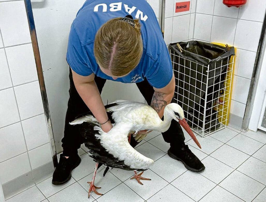 Eine Tierpflegerin nahm den Storch am Freitag im Mössinger NABU-Vogelschutzzentrum auf. Er war schwer verletzt, auch ein Flügel war ausgekugelt. FOTO: EBERWEIN