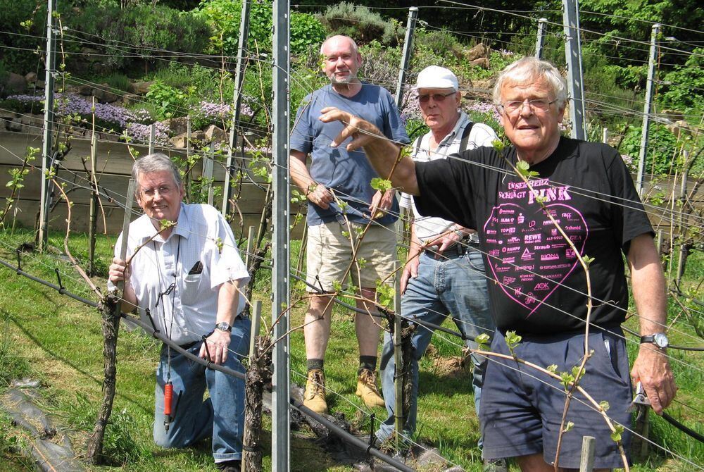 Das Hobby Weinbau wird sehr ernst genommen: vier der sechs Kirchentellinsfurter Wengerter an den Reben (von links), nämlich Siegfried Kirschbaum, Hans-Peter-Heinzel, Siegfried Wagner und Eberhard Schaich. GEA-ARCHIVFOTO: -JK