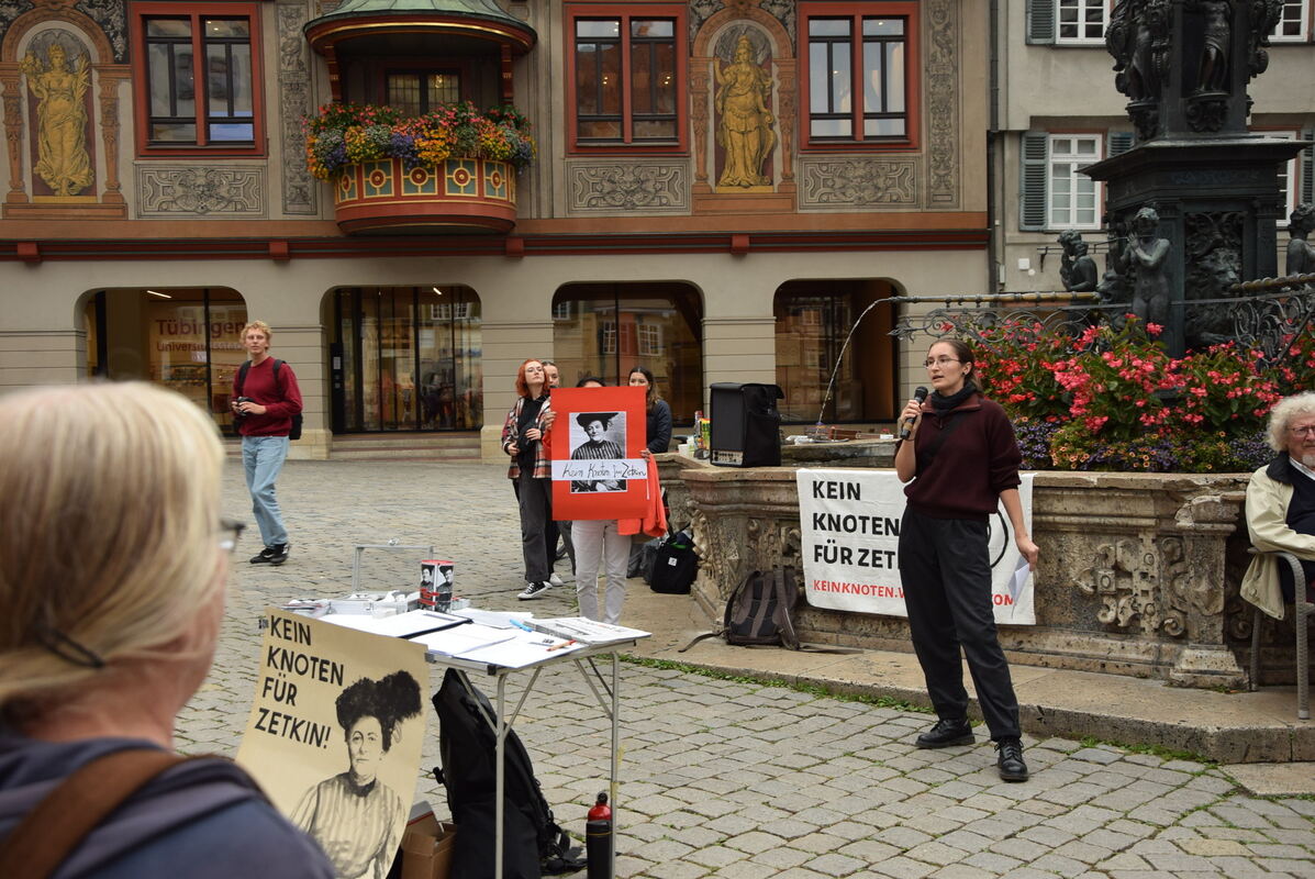 TÜBINGEN. Die Debatte über die Änderungen von Straßennamen in Tübingen geht weiter. Am Donnerstag protestierten rund 70 Menschen vor dem Rathaus mit dem Slogan »Kein Knoten für Zetkin«. Sie sind dagegen, das Straßenschild wie von der Stadtverwaltung vorgeschlagen, mit einer Markierung zu kennzeichnen.