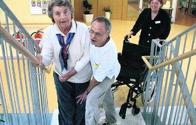 Kann nach dem Schlaganfall wieder gehen: Helene Wörner mit Therapeut Karl Zielinski und Jacqueline Gurski.