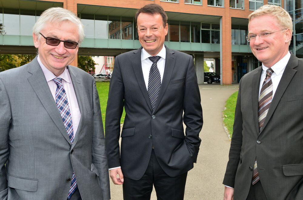 Gutgelaunt zur Amtseinführung (von links): Ministerialdirektor Julian Würtenberger aus dem Innenministerium, der neue Regierungspräsident Klaus Tappeser und sein Vize Utz Remlinger vor dem Regierungspräsidium.