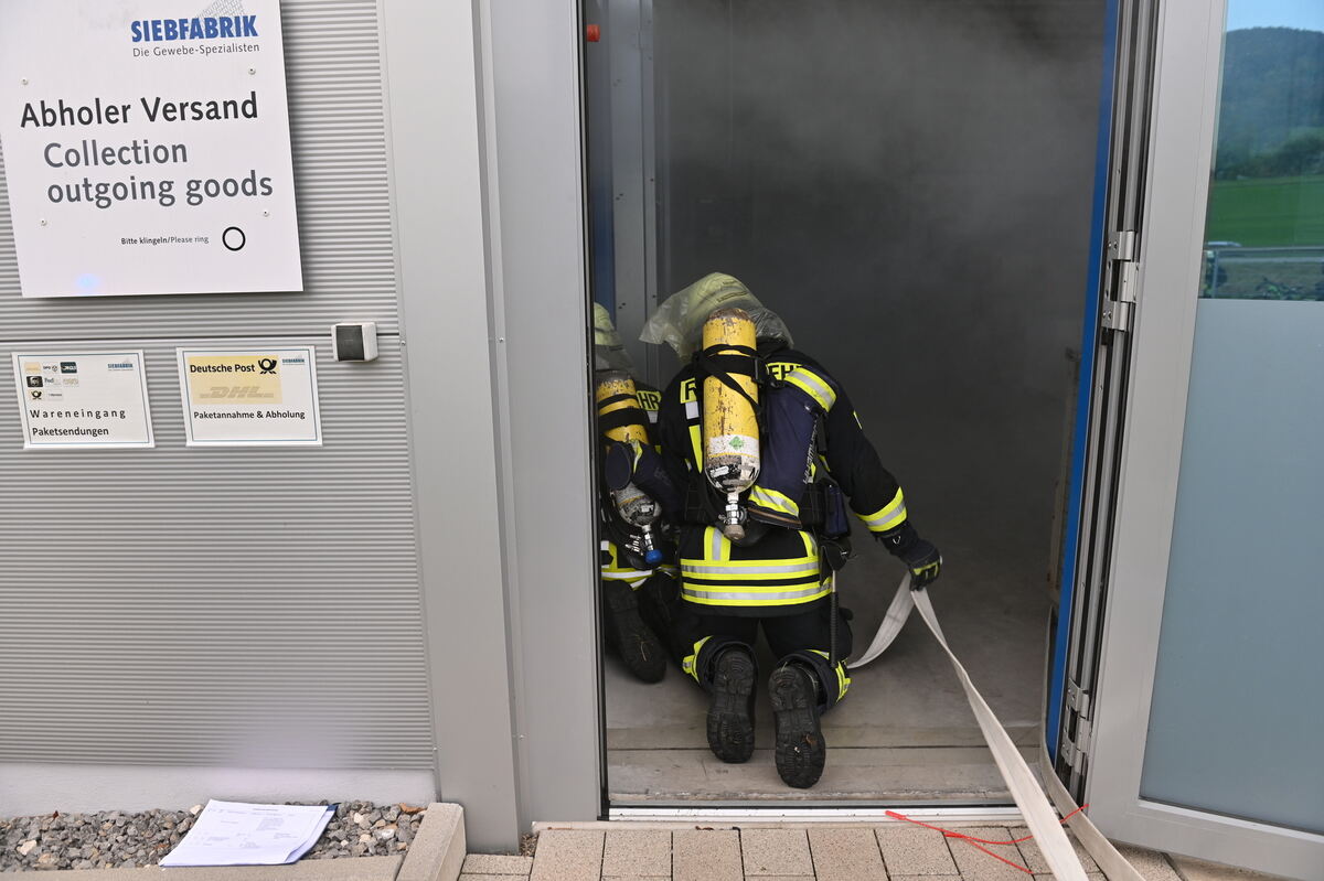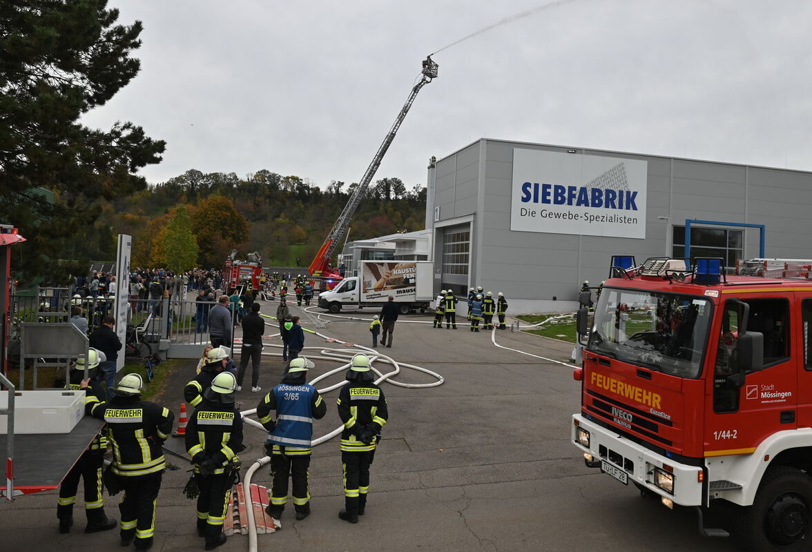 Höhepunkt der Übung unterm Öschinger Filsenberg: Die Drehleiter geht vor der Siebfabrik in Stellung.