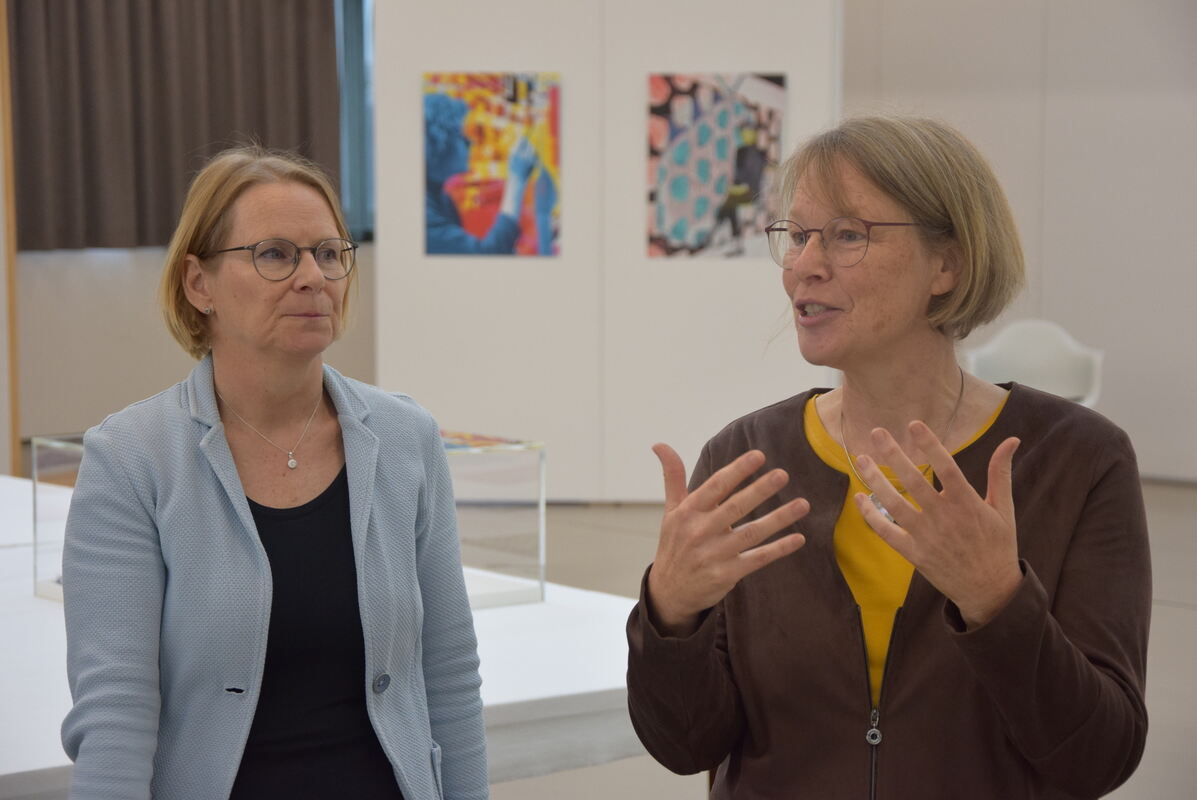 Insgesamt präsentiert die Ausstellung Werke von 24 Künstlerinnen. Exponate eingereicht hatten insgesamt 30 Künstlerinnen - doch sechs kamen nicht zum Zug. »Es gab eine harte Jury«, berichten Blum und die Gedok-Vertreterin Dr. Kathrin Fastnacht. Insgesamt, so Blum weiter, habe man ein Drittel der eingereichten Kunstwerke nicht berücksichtigt. »Kriterien waren die künstlerische Qualität, die Passung zum Thema und zueinander und natürlich zur Raumsituation«, ergänzt Fastnacht. Gezeigt werden ganz unterschiedliche Kunstwerke, von klassischen Bildern über Fotomontagen bis hin zu Glas- und Porzellankunst. Teile der umfangreichen Stoffsammlung der Pausa werden gezeigt - und deren Interpretation durch die heutigen Künstlerinnen. Die Pausa-Sammlung mit über 88.000 Stoffmustern hat auch Fastnacht beeindruckt: »Hier gibt es noch viel mehr Schätze, die gehoben werden müssten.«