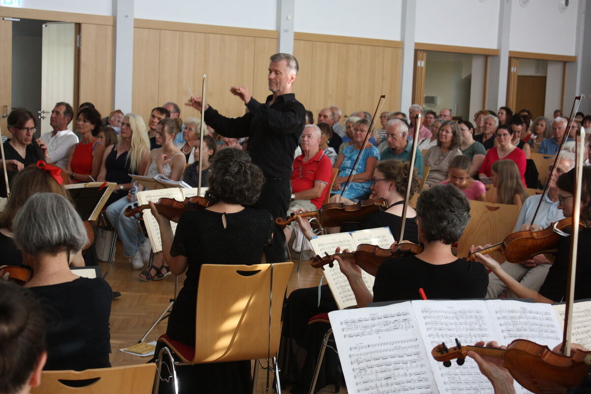 Dirigent Thomas J. Mandl und die Streicher befanden sich im Parkett, die Bläser auf der Bühne der Richard-Wolf-Halle.
