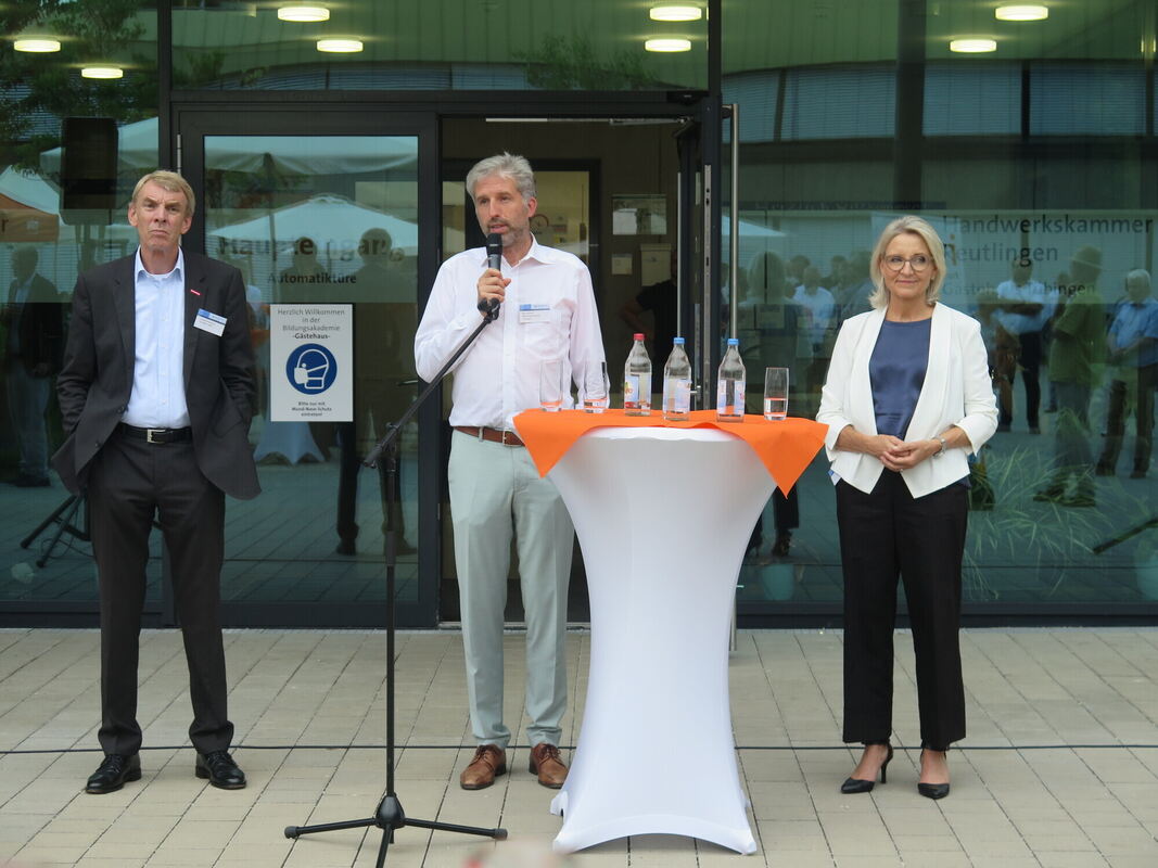 Harald Herrmann (links), Präsident der Handwerkskammer Reutlingen, Tübingens Oberbürgermeister Boris Palmer und Daniela Eberspächer-Roth, Vizepräsidentin der IHK Reutlingen, loteten Gemeinsamkeiten, aber auch Unterschiede aus. FOTO: STURM