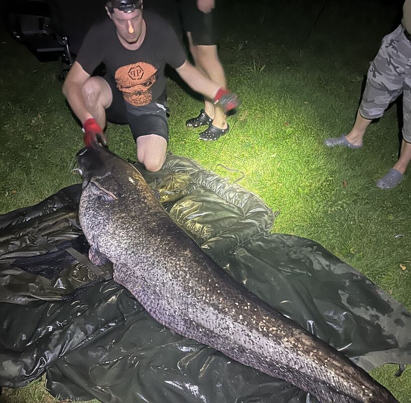 Kurz nach dem Fang: Der Wels ist nach Angaben des Vereins mehr als 2,20 Meter lang und brachte 81 Kilo auf die Waage.