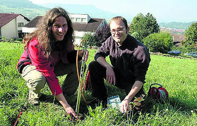 Rainer Bell (links) und Marco Danscheid bei ihren Inklinometer-Messungen am Öschinger Auchterthang.