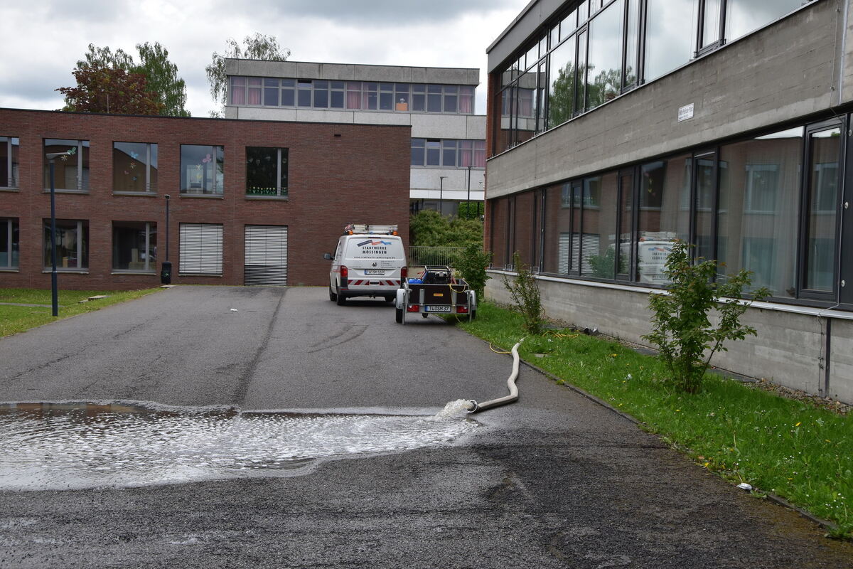 Die Feuerwehr pumpt das Wasser aus dem Untergeschoss der Friedrich-List-Gemeinschaftsschule.