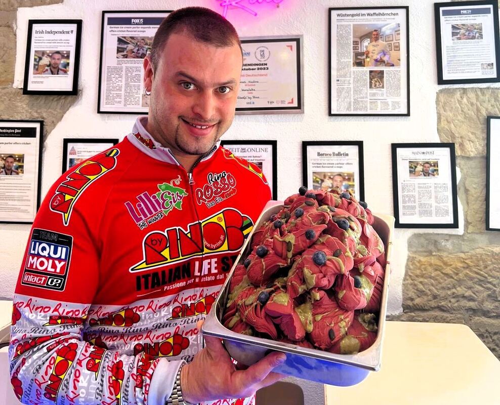 Thomas Micolino und sein neues »Anti-Aging-Eis«, wie er es ab Montag in seiner Eistheke präsentieren will. Es besteht aus Heidelbeeren, Kollagenpulver und grüner Soße aus Kürbiskernen. Er steht vor seiner »Wall of Fame«, einer Wand in seinem Eiscafé, an der er Zeitungsartikel aus der ganzen Welt gehängt hat, in denen über seine schrägen Eiskreationen, wie etwa das Grillen-Eis berichtet wurde.